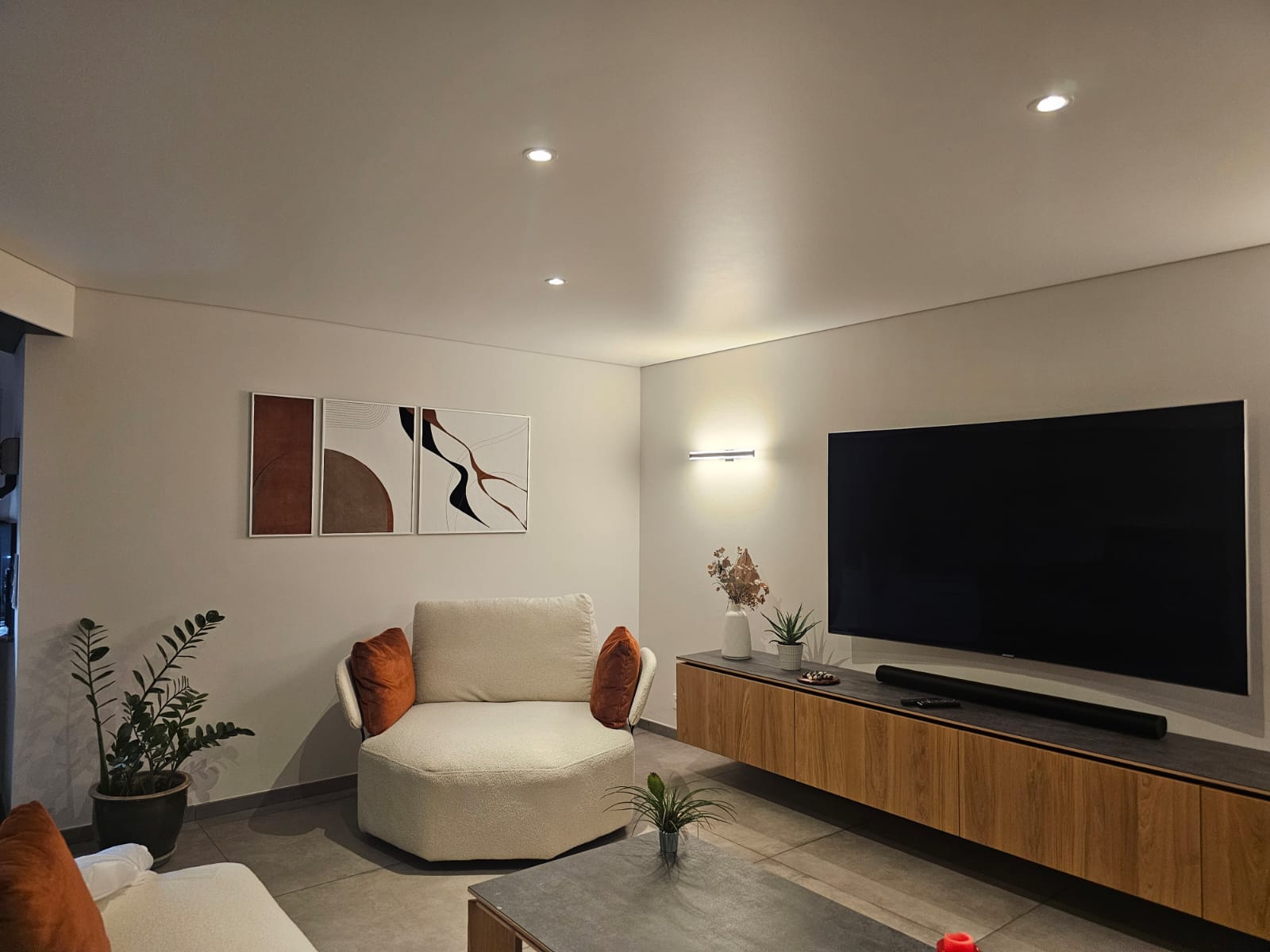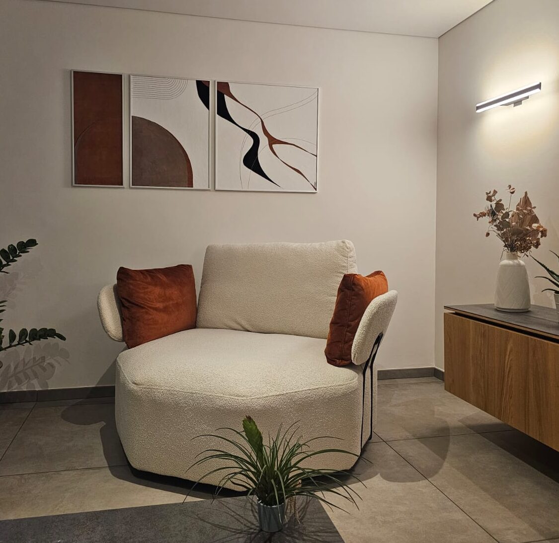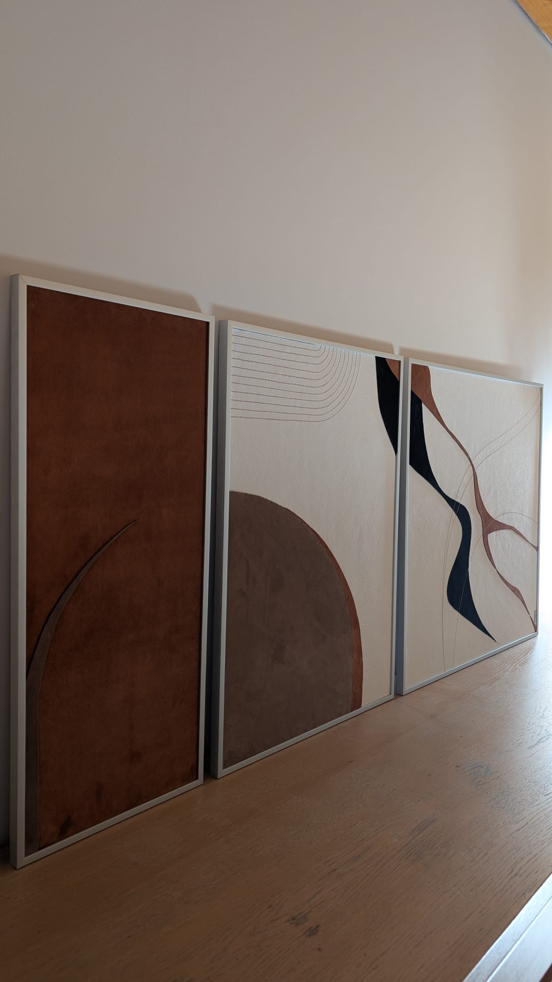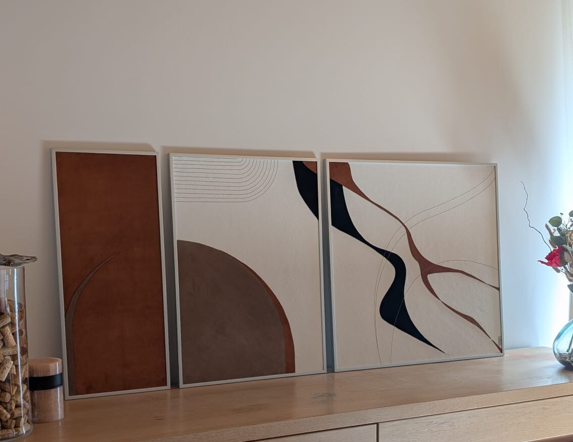 Chaque tableau joue avec des formes arrondies et des aplats, dans une palette de bruns, beiges et noirs, uniquement avec du cuir de vache.. Les trois pièces sont liées par des lignes qui semblent amorcer un mouvement, puis s’arrêter. Elles se répondent par des échos de formes et de rythmes, créant une continuité visuelle tout en gardant leur singularité.