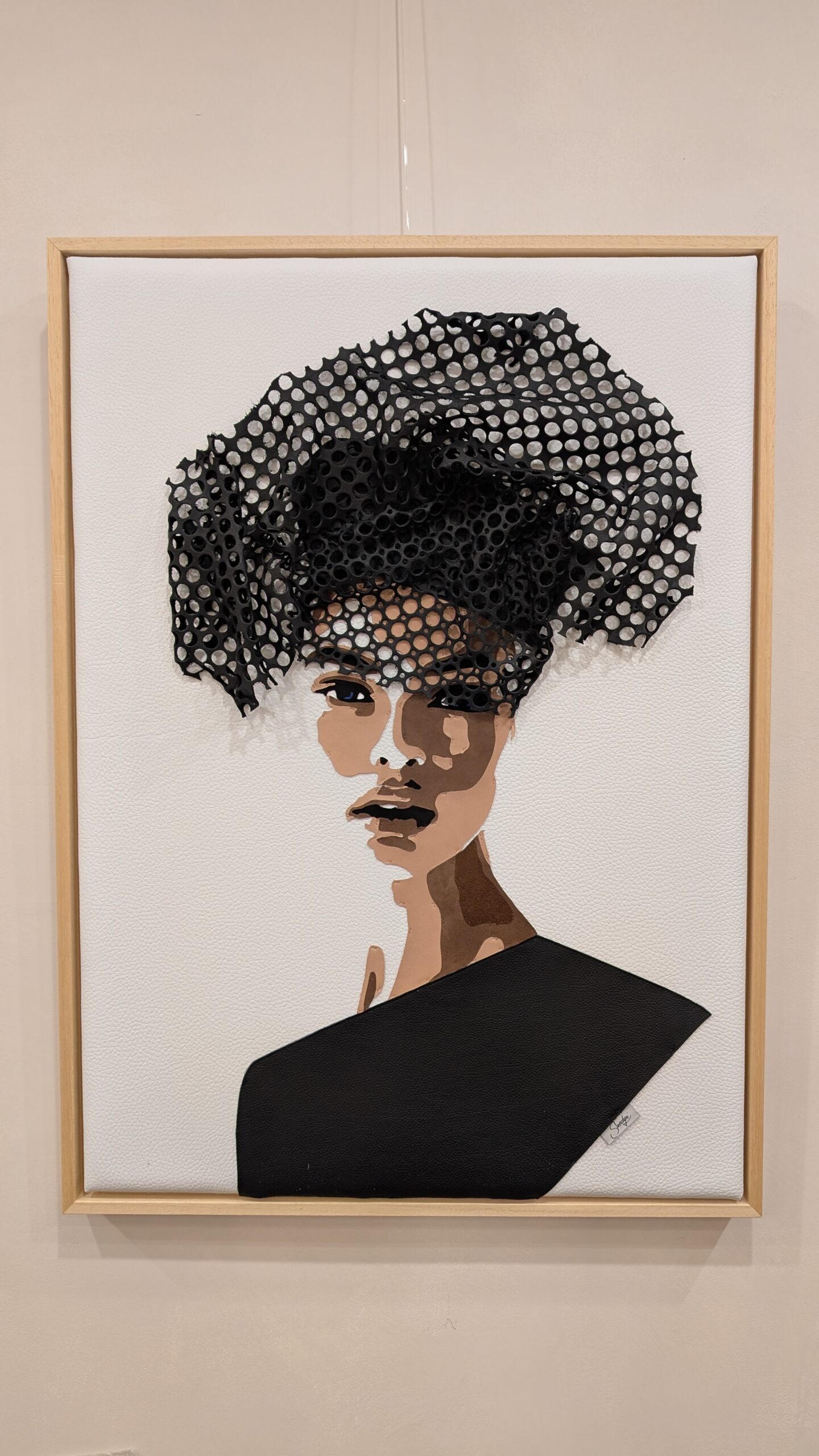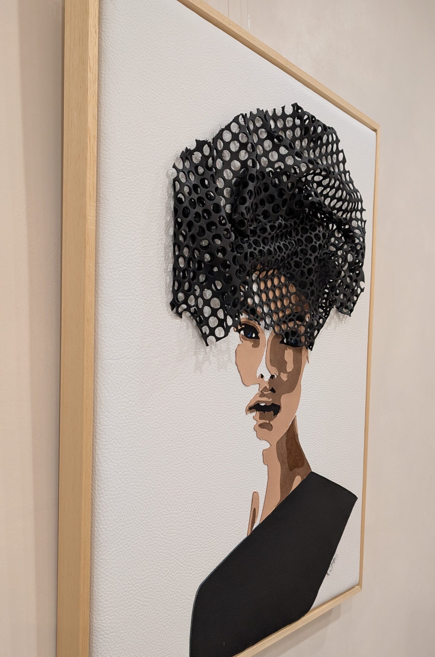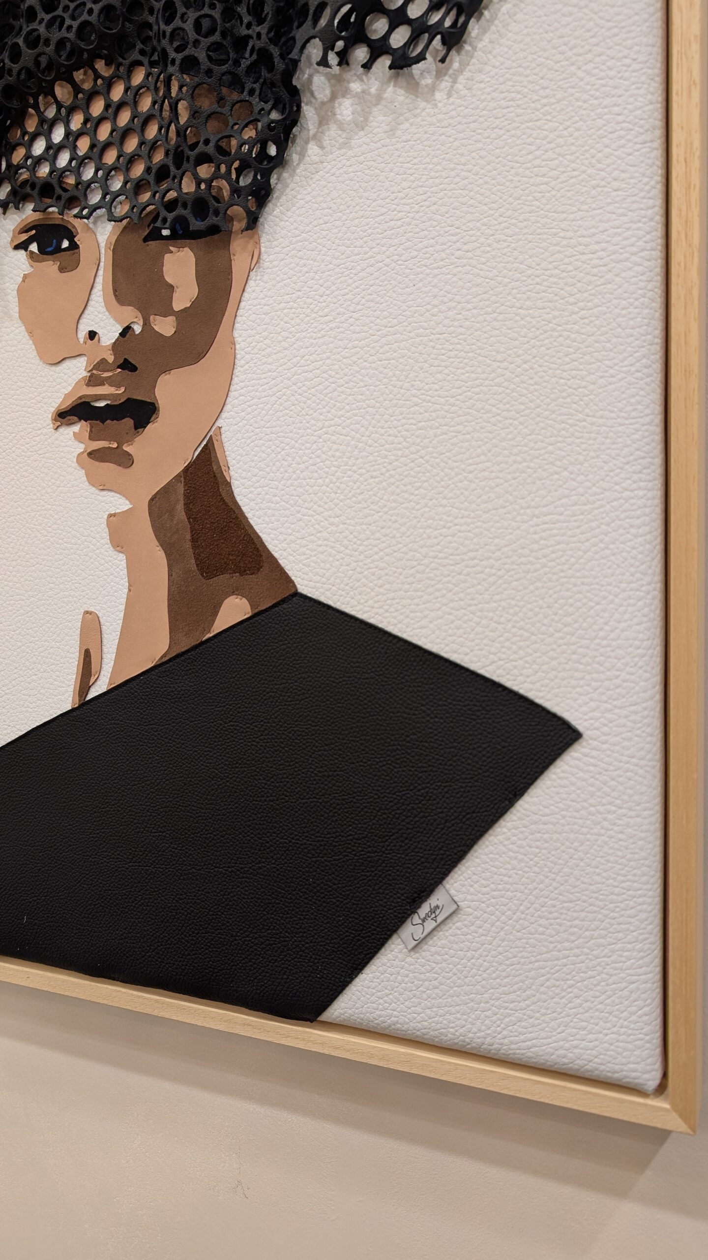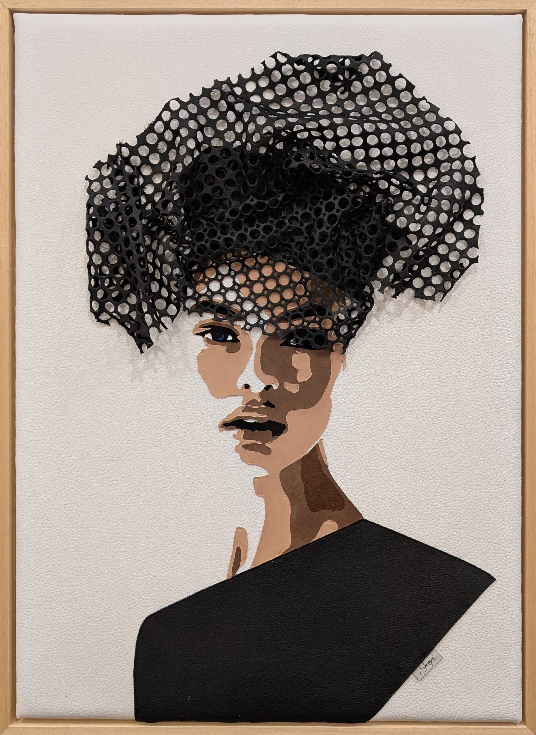 Différents cuirs composent le tableau, les coutures, elles, sont à la main et à la machine.
