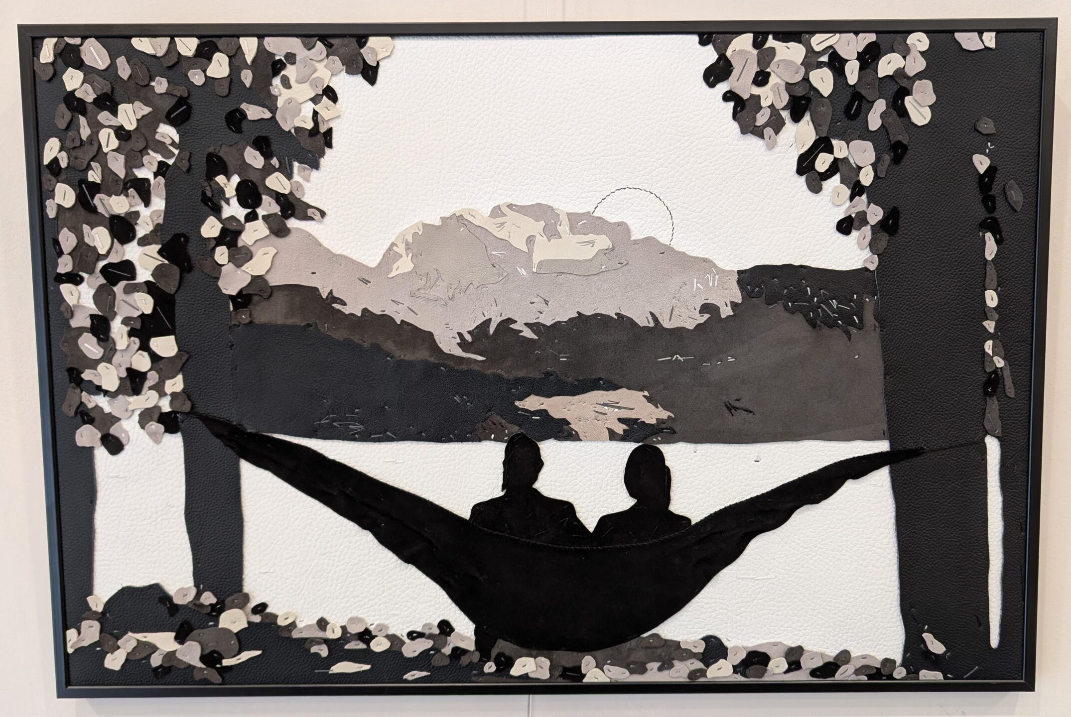 Cette création sur mesure est entièrement réalisée en cuir, un matériau noble et vivant qui donne une profondeur et une texture uniques à l’œuvre. Inspirée par la majestueuse montagne de la Tournette, qui surplombe le lac d’Annecy 🌄 Cette composition met en scène un couple profitant d’un moment suspendu dans le temps, allongé sur un hamac ✨
