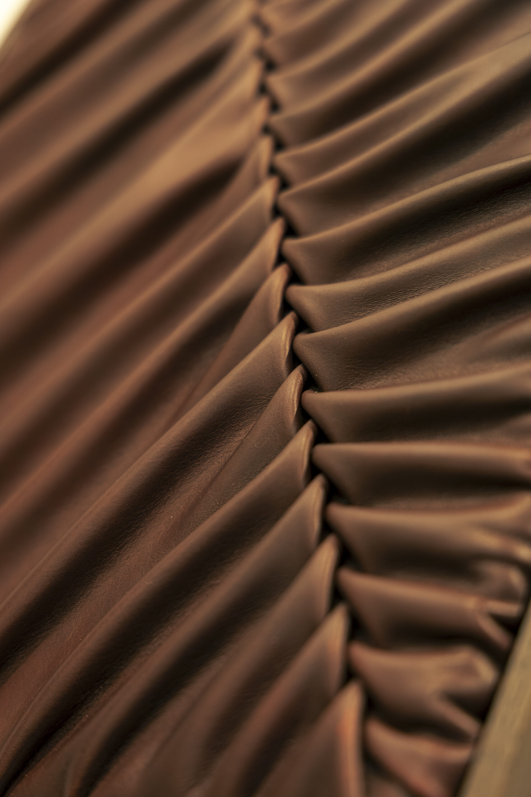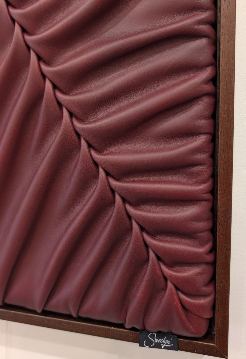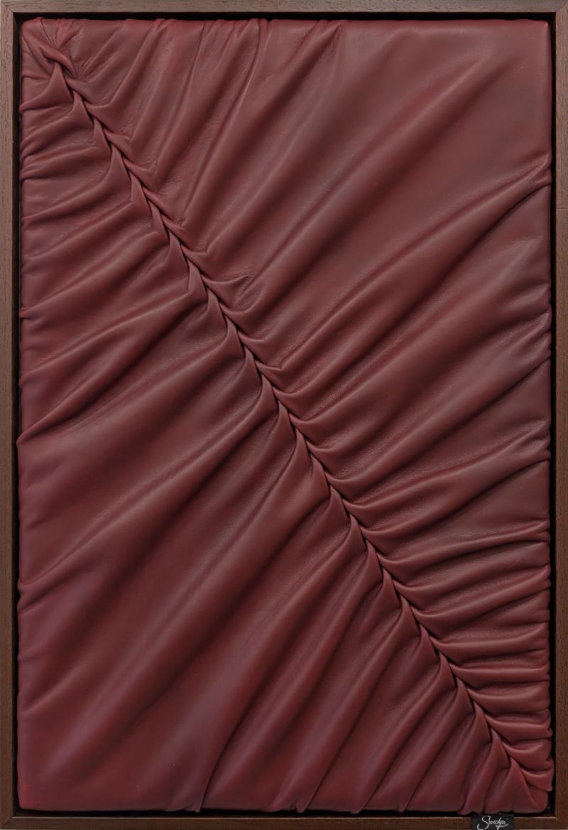 Cette œuvre met en lumière la richesse texturale et l’élégance d’un cuir finement tressé. Les nuances naturelles du cuir jouant avec la lumière, révèlent une profondeur subtile. Une célébration de la matière brute dans une composition à la fois sobre et sophistiquée. Du cuir de vachette compose ce tableau.