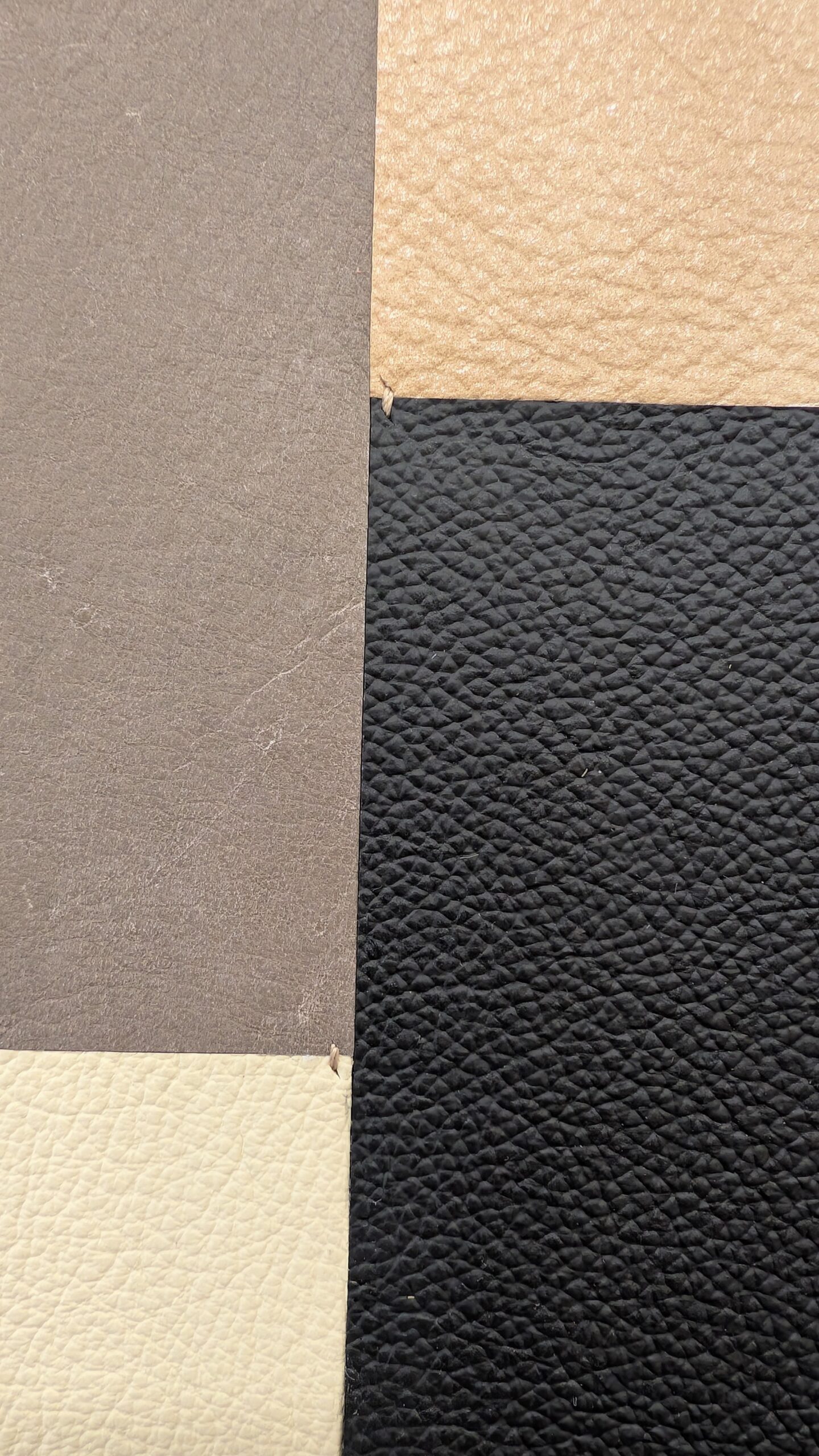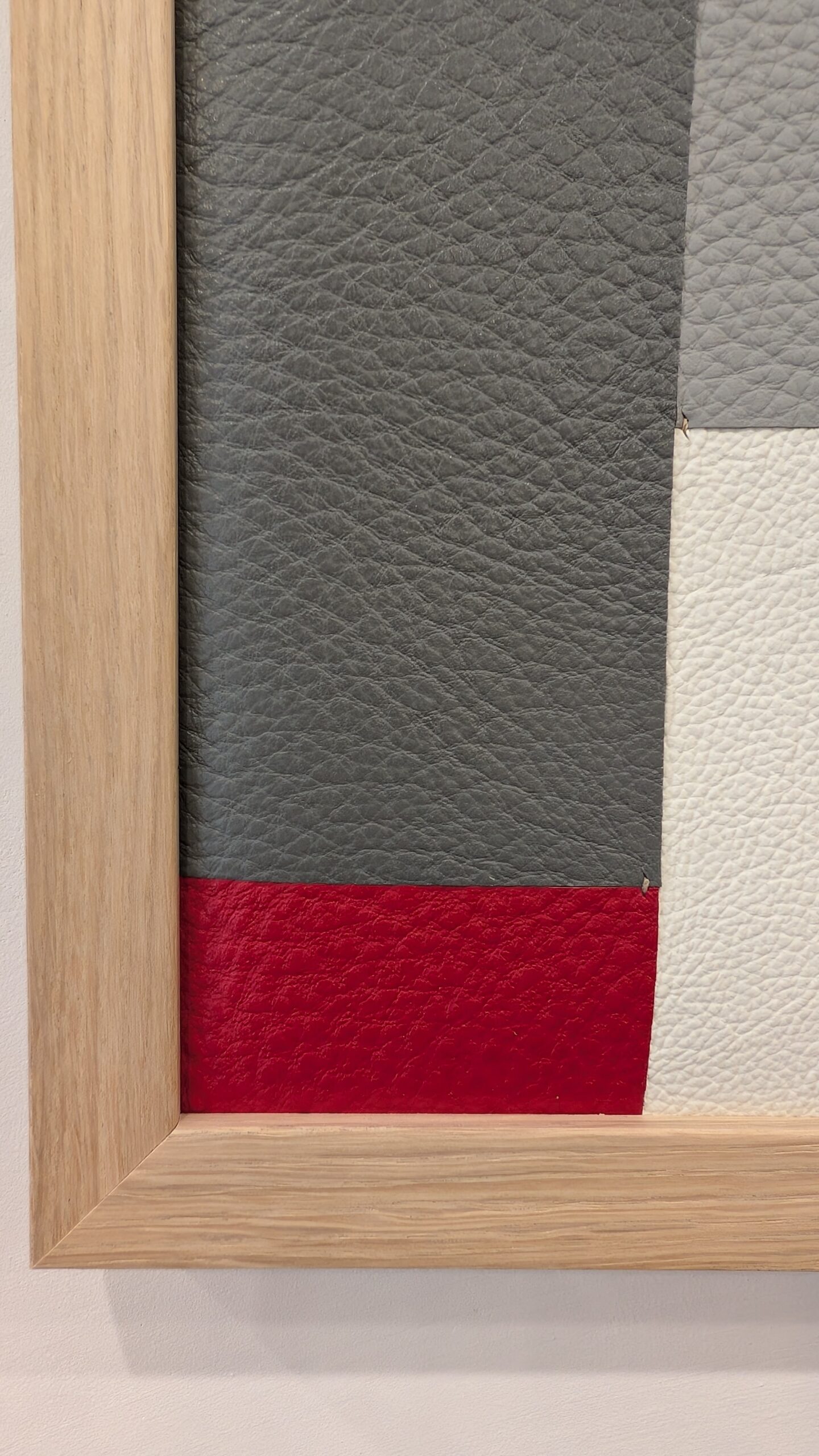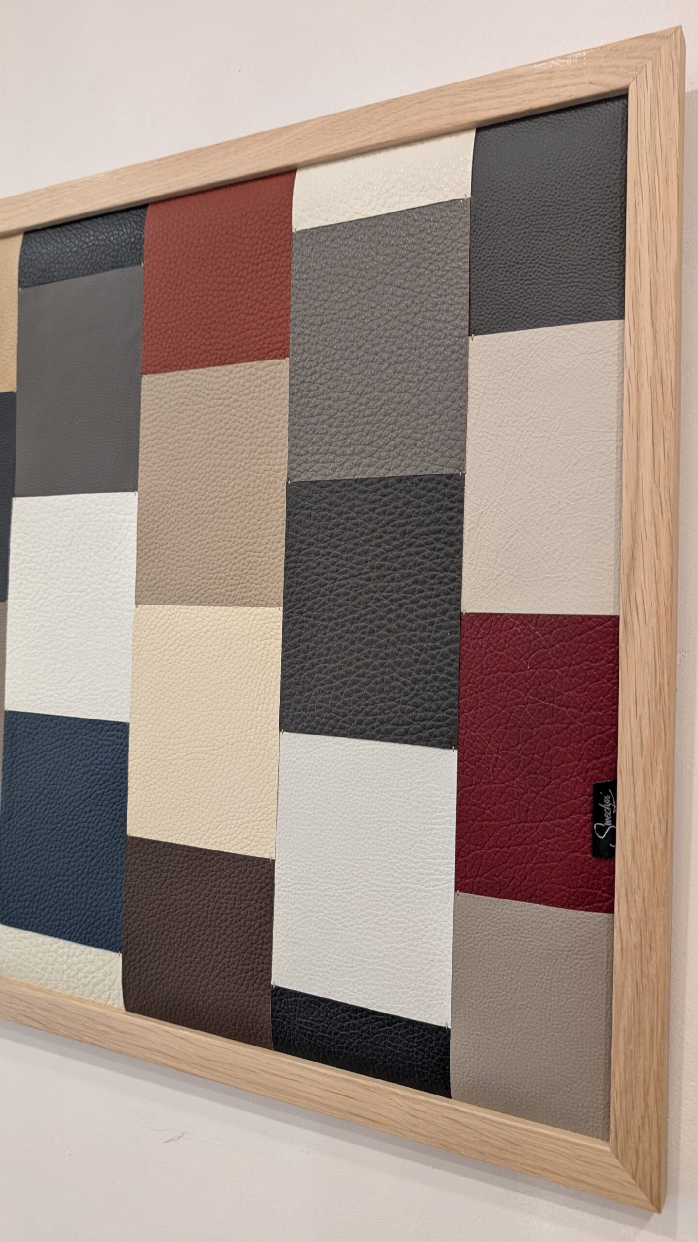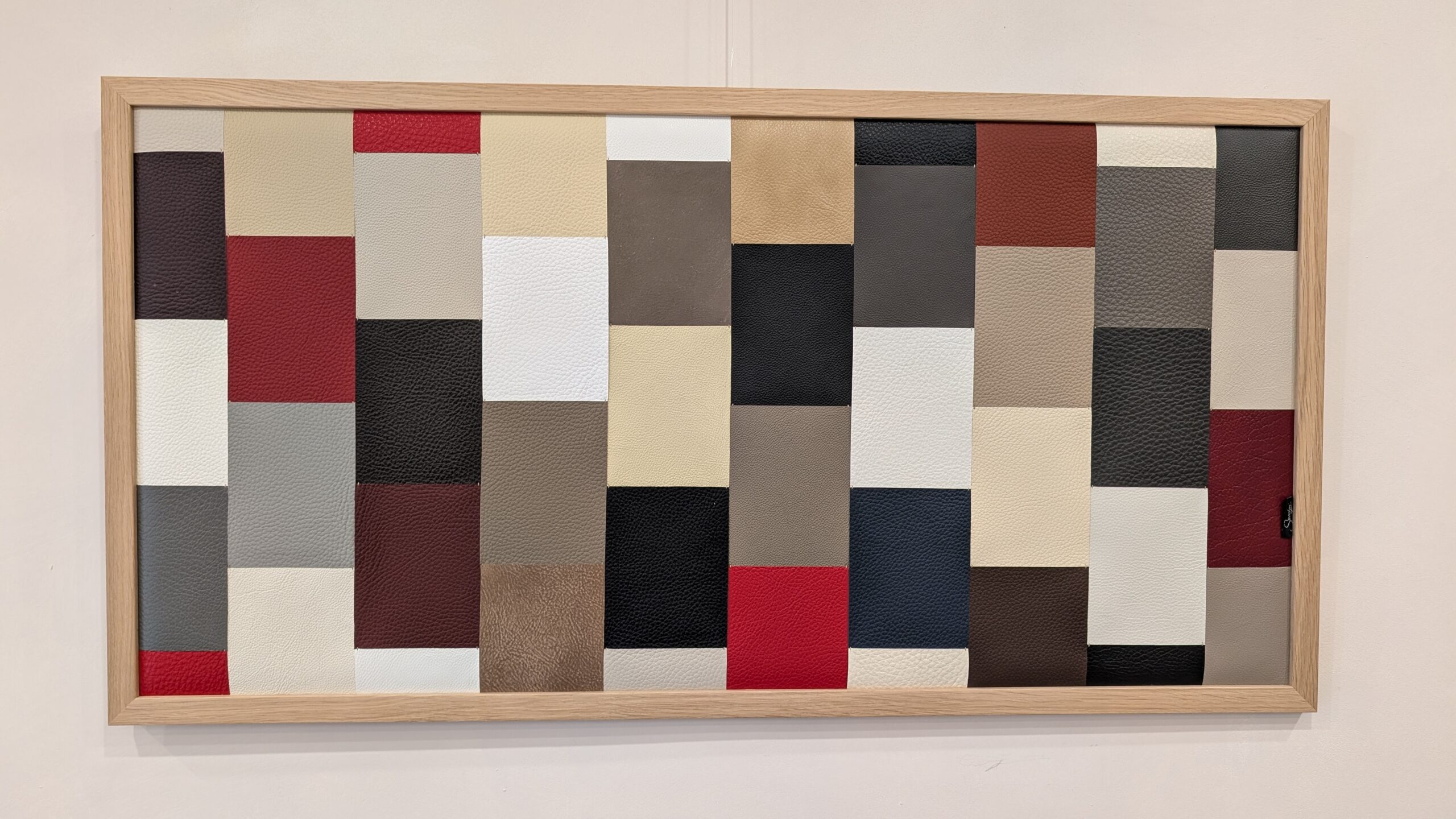 Différents cuirs de bovins définissent le tableau. Couture main.