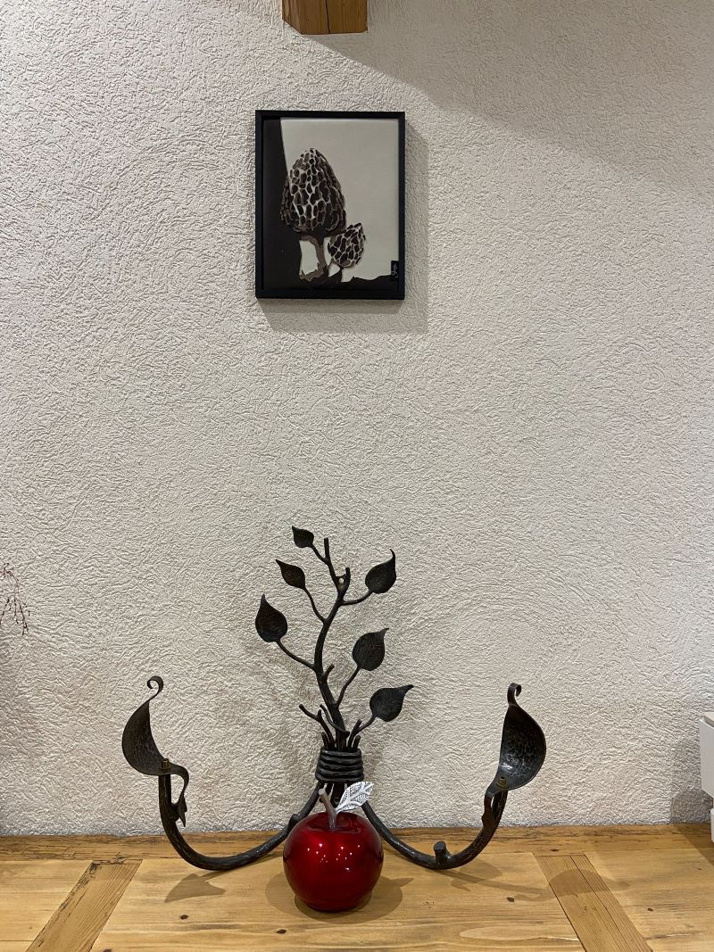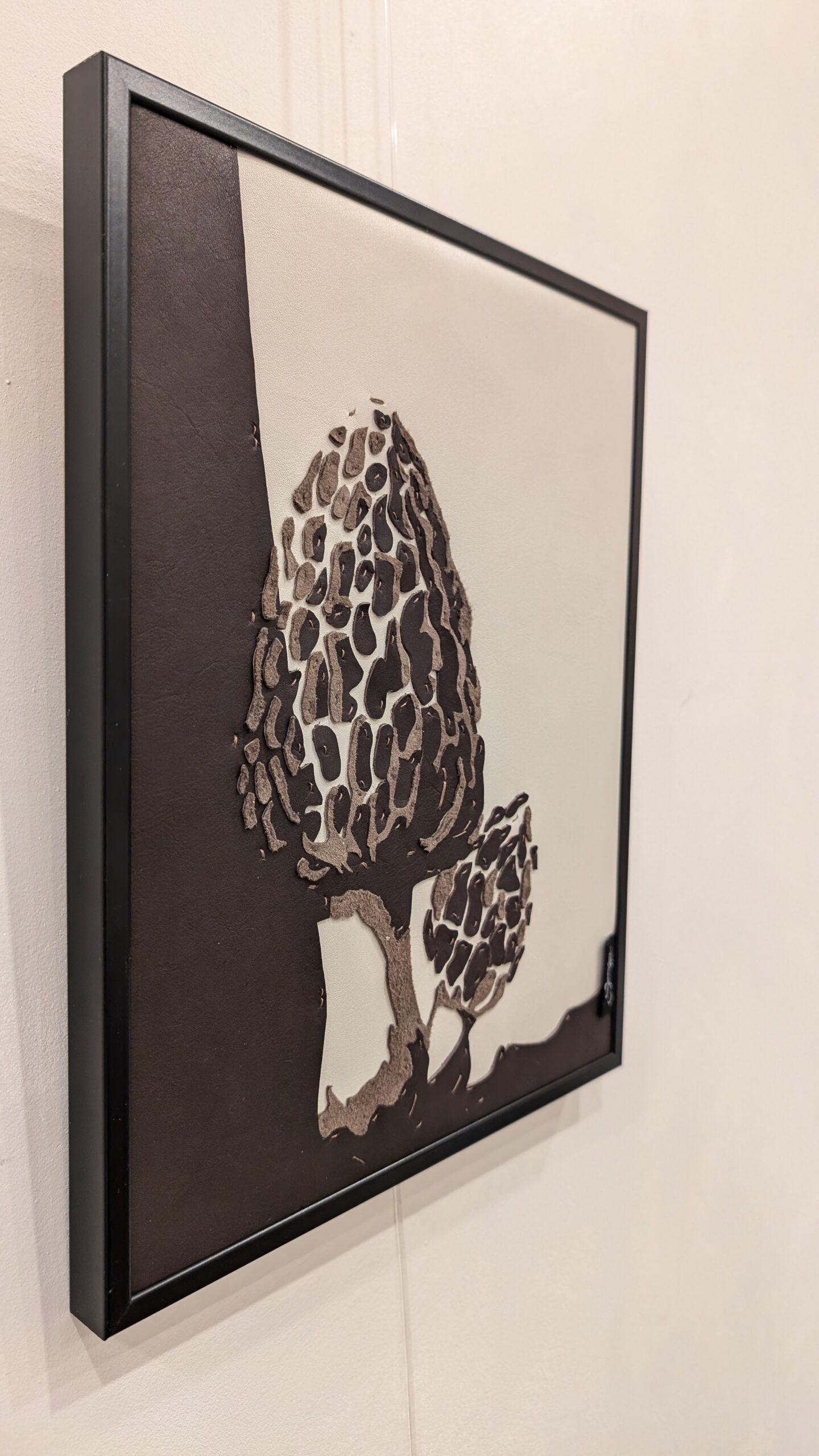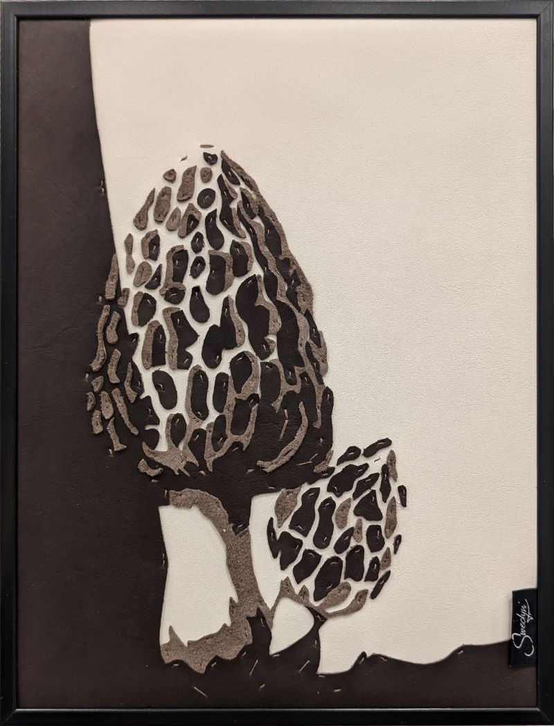 Ce champignon rare, très apprécié des connaisseurs, est une richesse de la nature. Sa beauté et sa fragilité sont imitées par la finesse et l’élégance du cuir. Du cuir de vache et de chèvre compose le tableau avec uniquement des coutures machines.