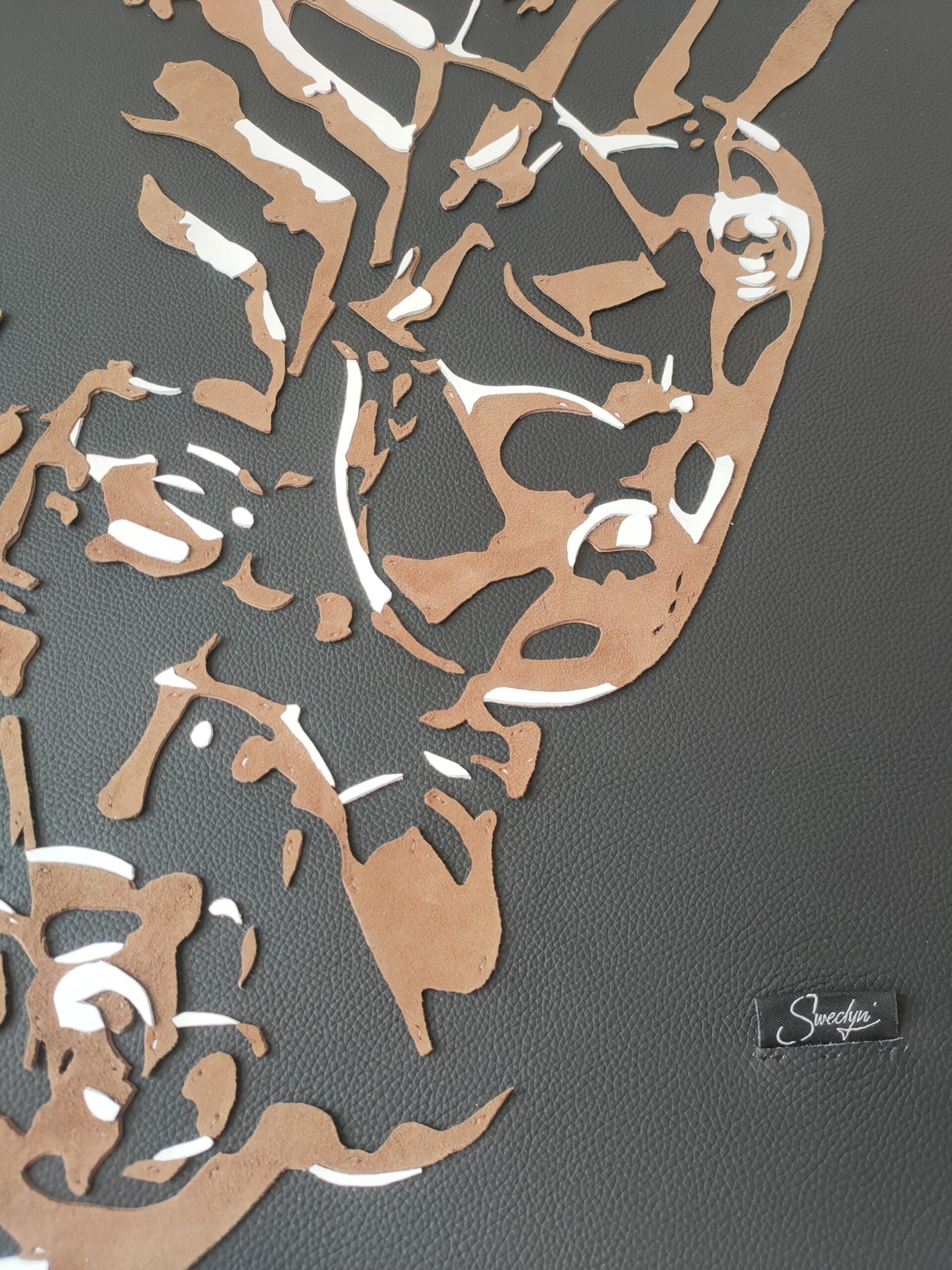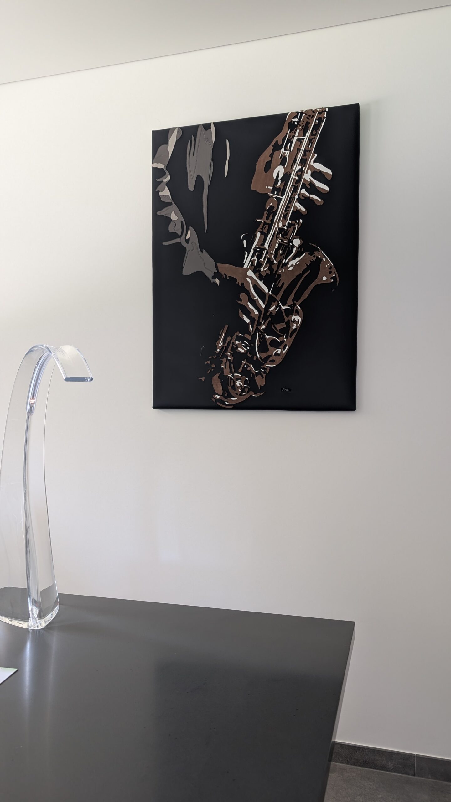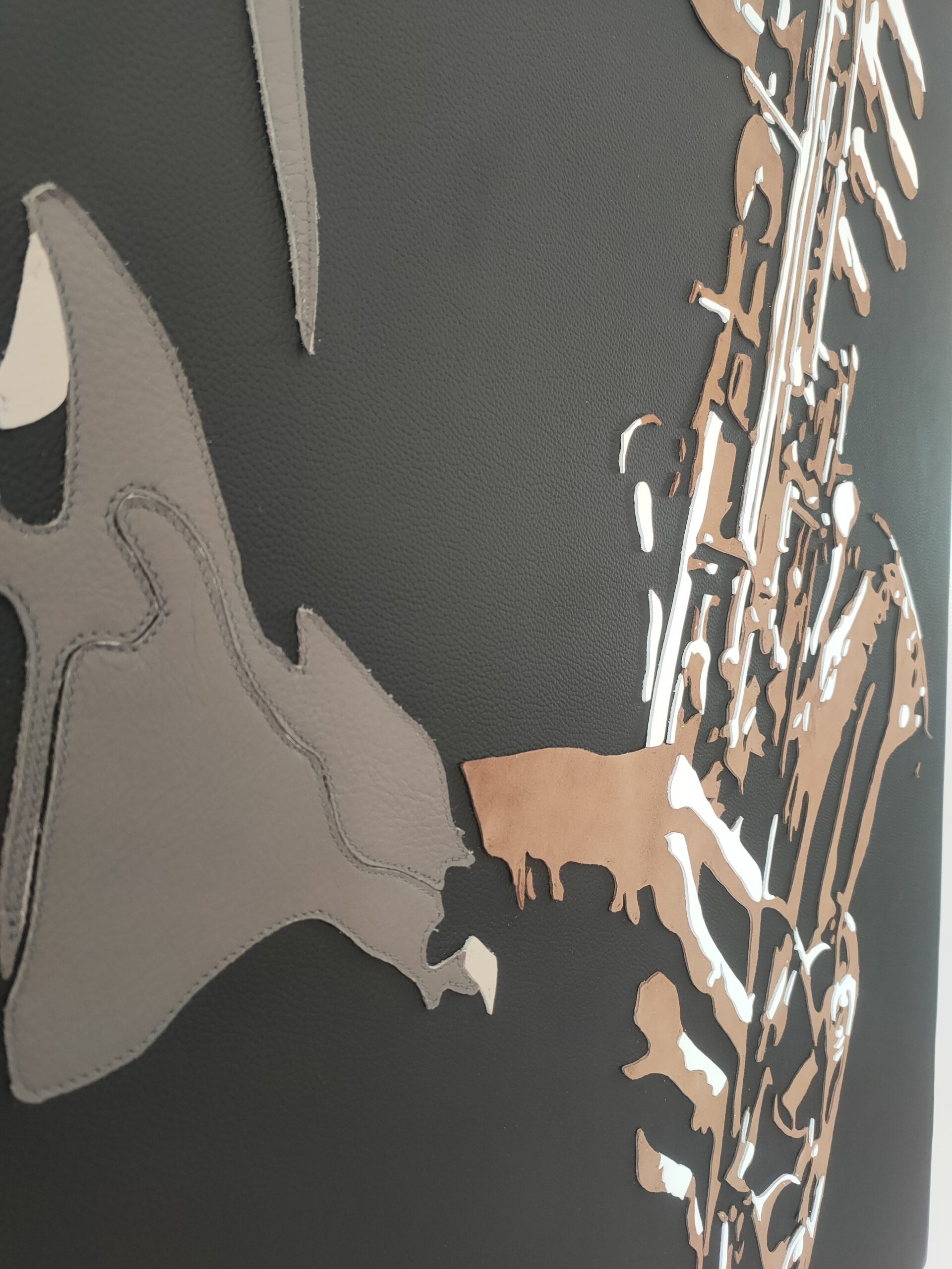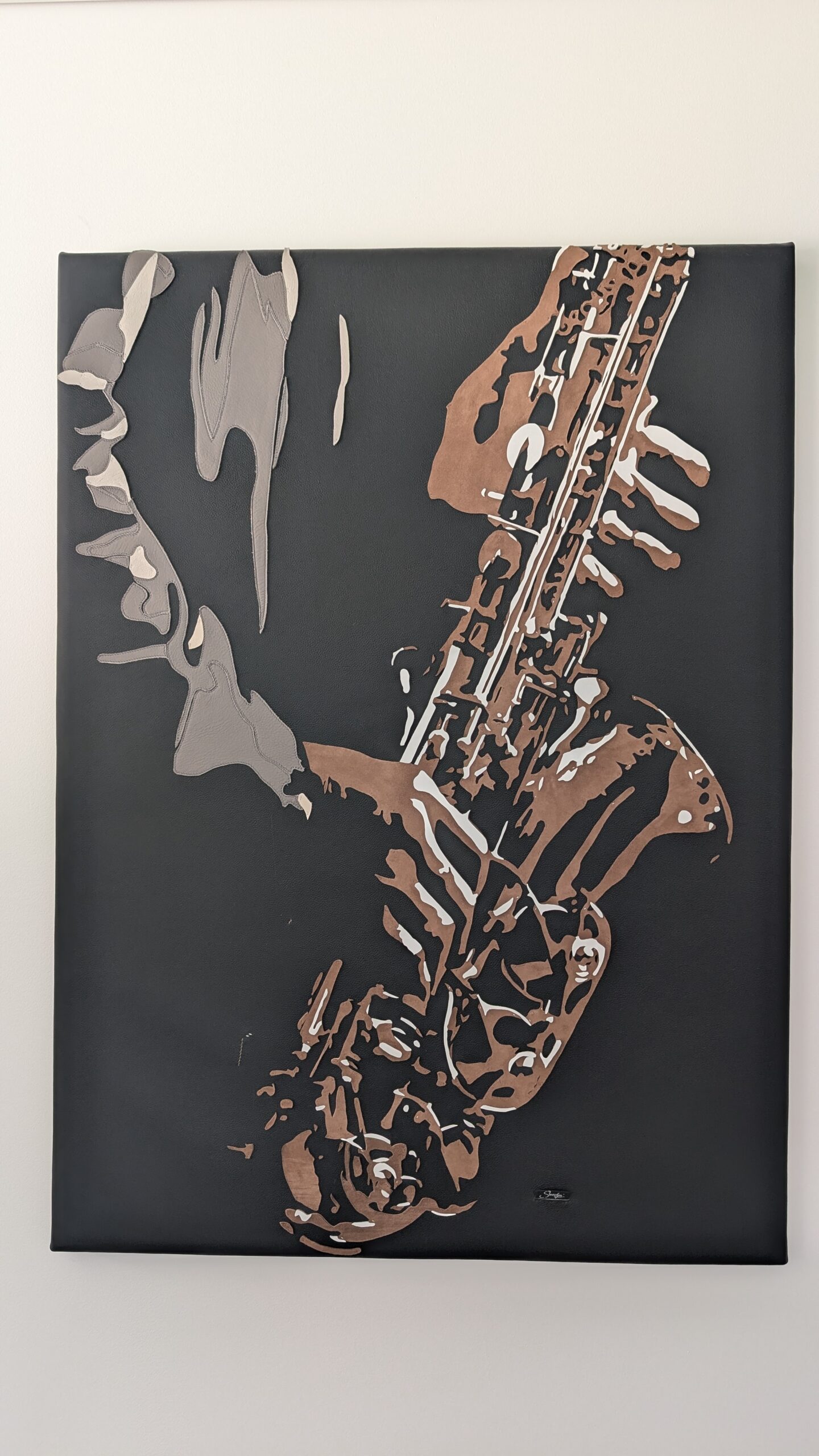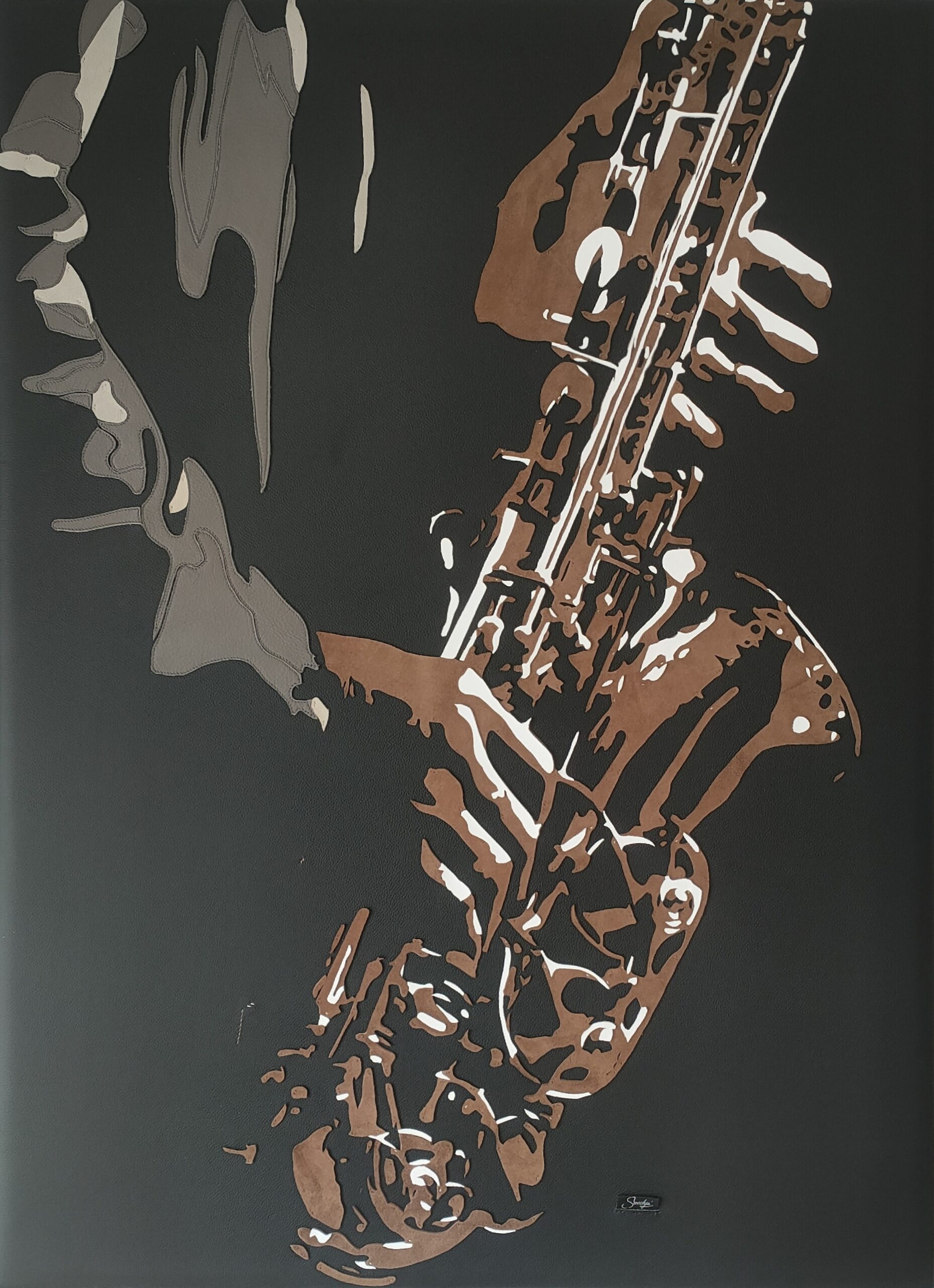 Ce tableau met en lumière le saxophone, mon instrument préféré. Sa sonorité chaude et envoûtante m’inspire profondément. À travers ses courbes dorées et ses vibrations, je retrouve une liberté musicale qui me touche à chaque note. Plusieurs cuirs de vache avec des finitions différentes (grainé, lisse, couleur) et un cuir de chèvre. Coutures à la main et à la machine.