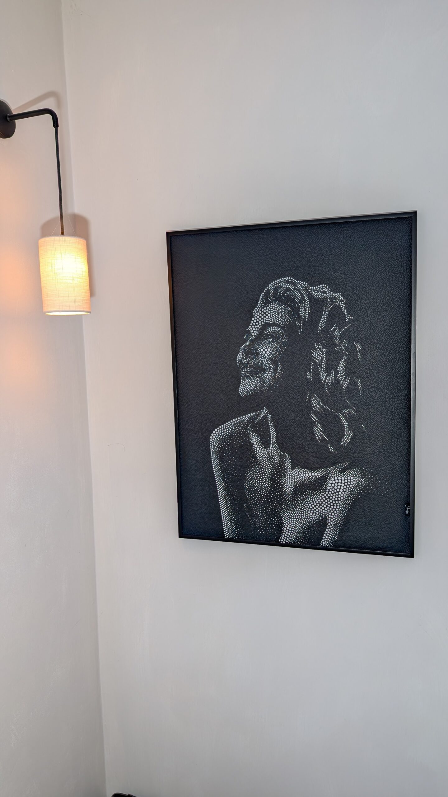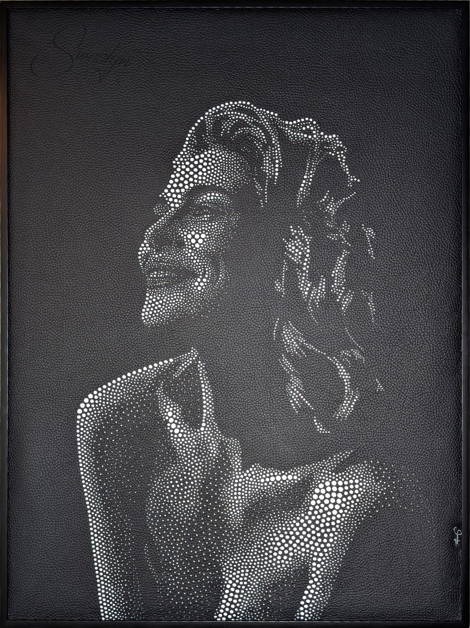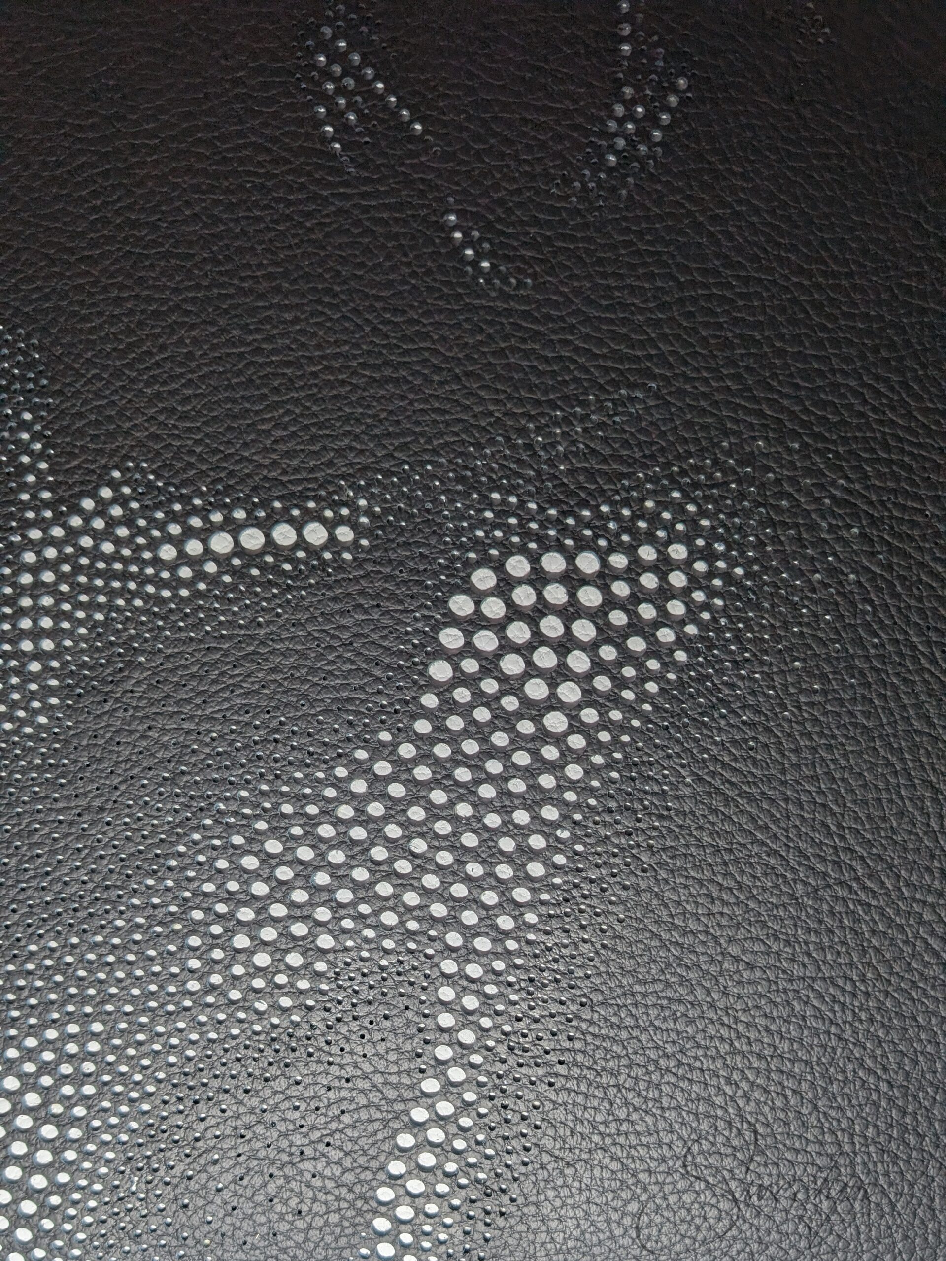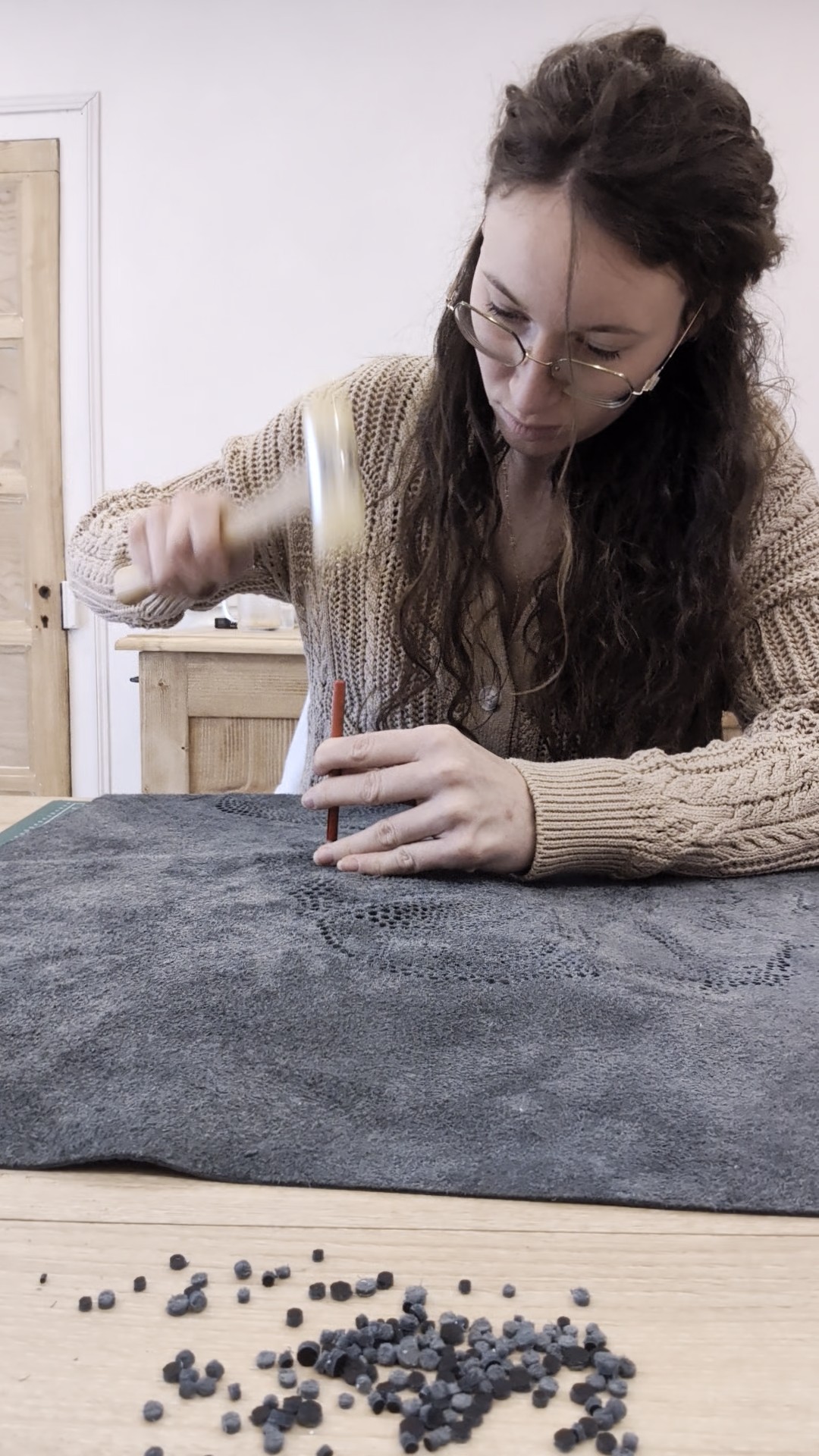 Chaque perforation est réalisée manuellement, à l’aide d’emporte‑pièces ronds de diamètres variés, de 6 mm à 1 mm pour un total de plus de 6300 perforations. Plus le trou est large, plus la lumière affleure, créant un jeu subtil de contrastes et de profondeur.
