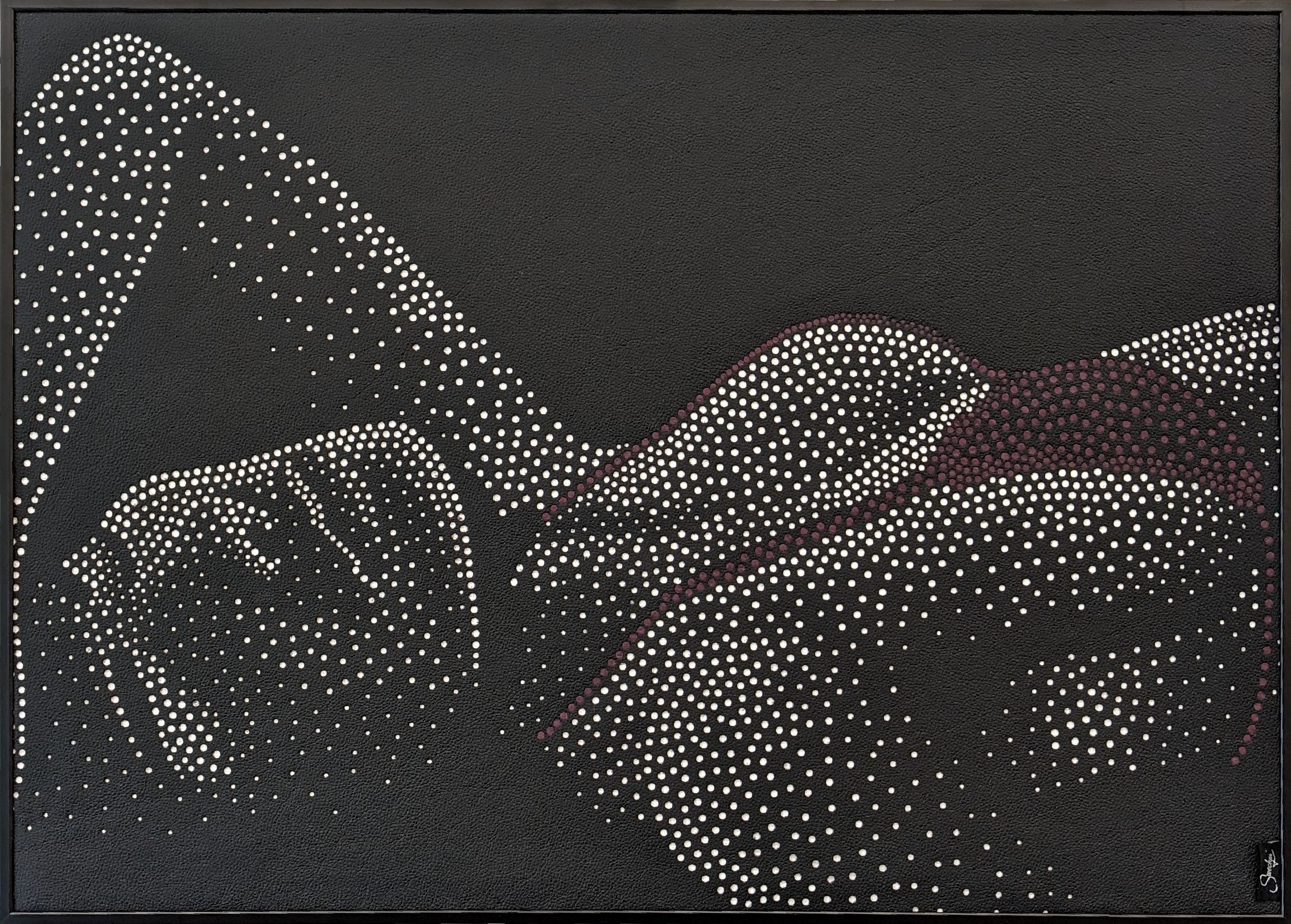 Commande libre autour du thème du nu et du visage en pointillisme, cette œuvre reflète les souhaits du client, notamment l’intégration de la couleur violette. Intitulée « Rêveuse stellaire », elle mêle sensualité, mystère et délicatesse dans une composition à la fois intime et cosmique.