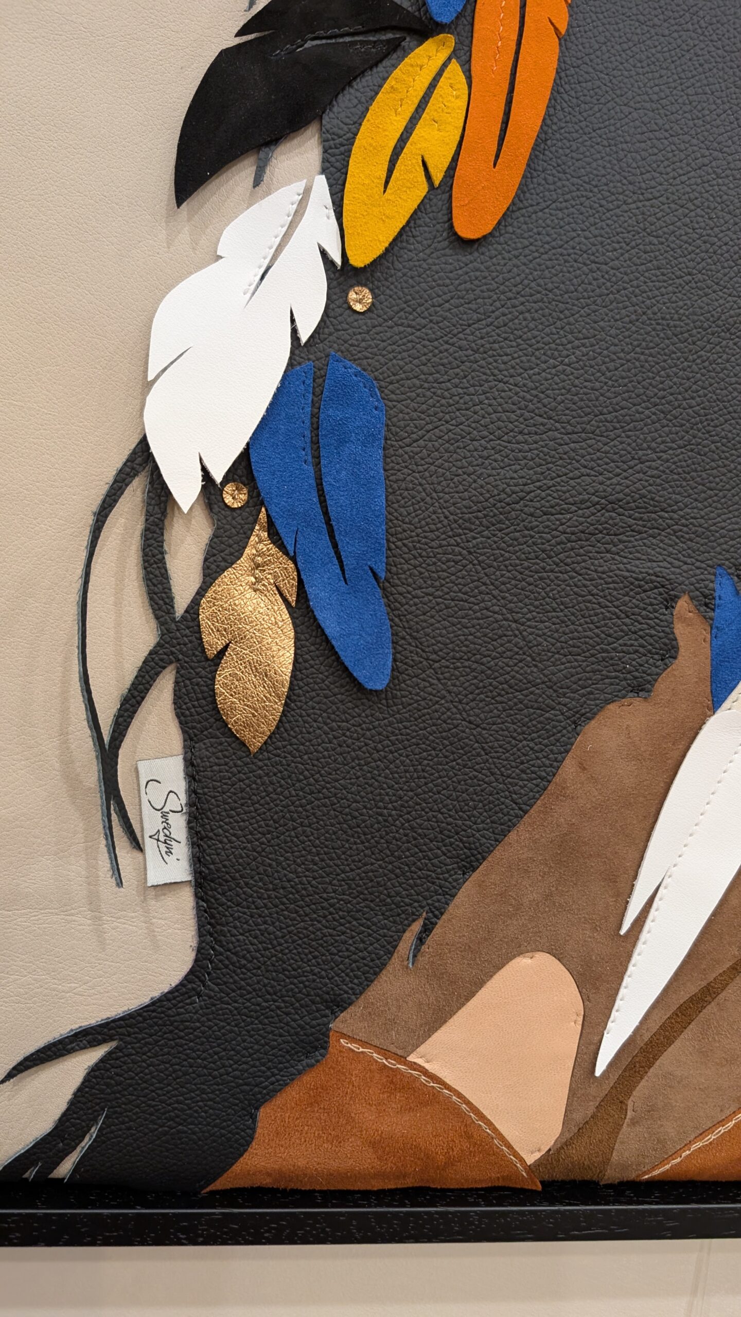 Plusieurs sortes de cuirs composent le tableau. Certaines coutures sont réalisées à la main et d’autres à la machine.