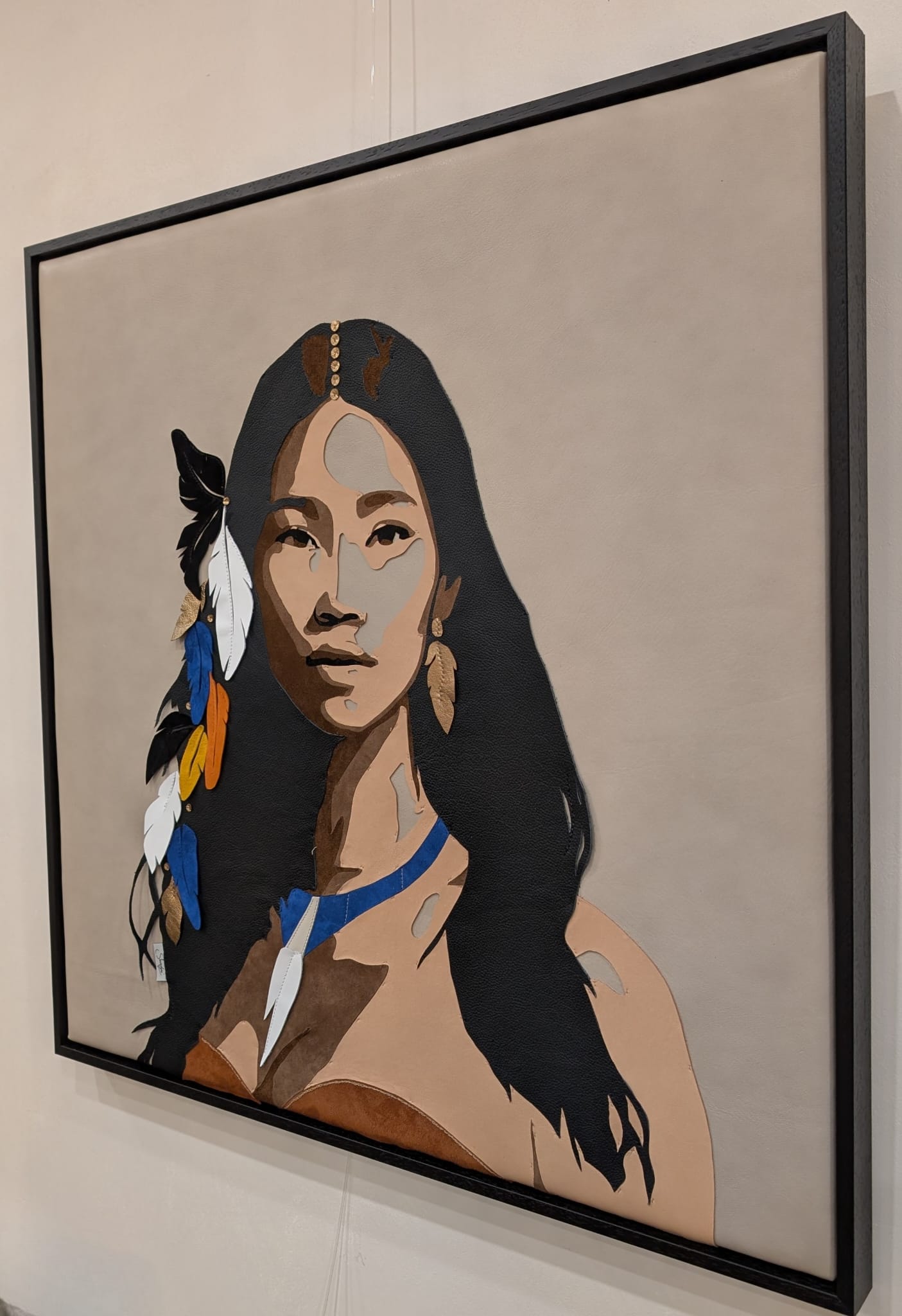 Cette œuvre saisit la beauté et la sagesse d’une femme d’origine indienne, son visage empreint de sérénité et de force. Ses cheveux noirs, fluides et soyeux, sont parés de plumes colorées qui ajoutent une touche vibrante et mystique à l’ensemble. Les plumes dans des teintes de rouge bleu et jaune symbolisent la connexion avec la nature et l’esprit libre. Le portrait, à la fois puissant et délicat, rend hommage à l’harmonie entre l’humain et les éléments.